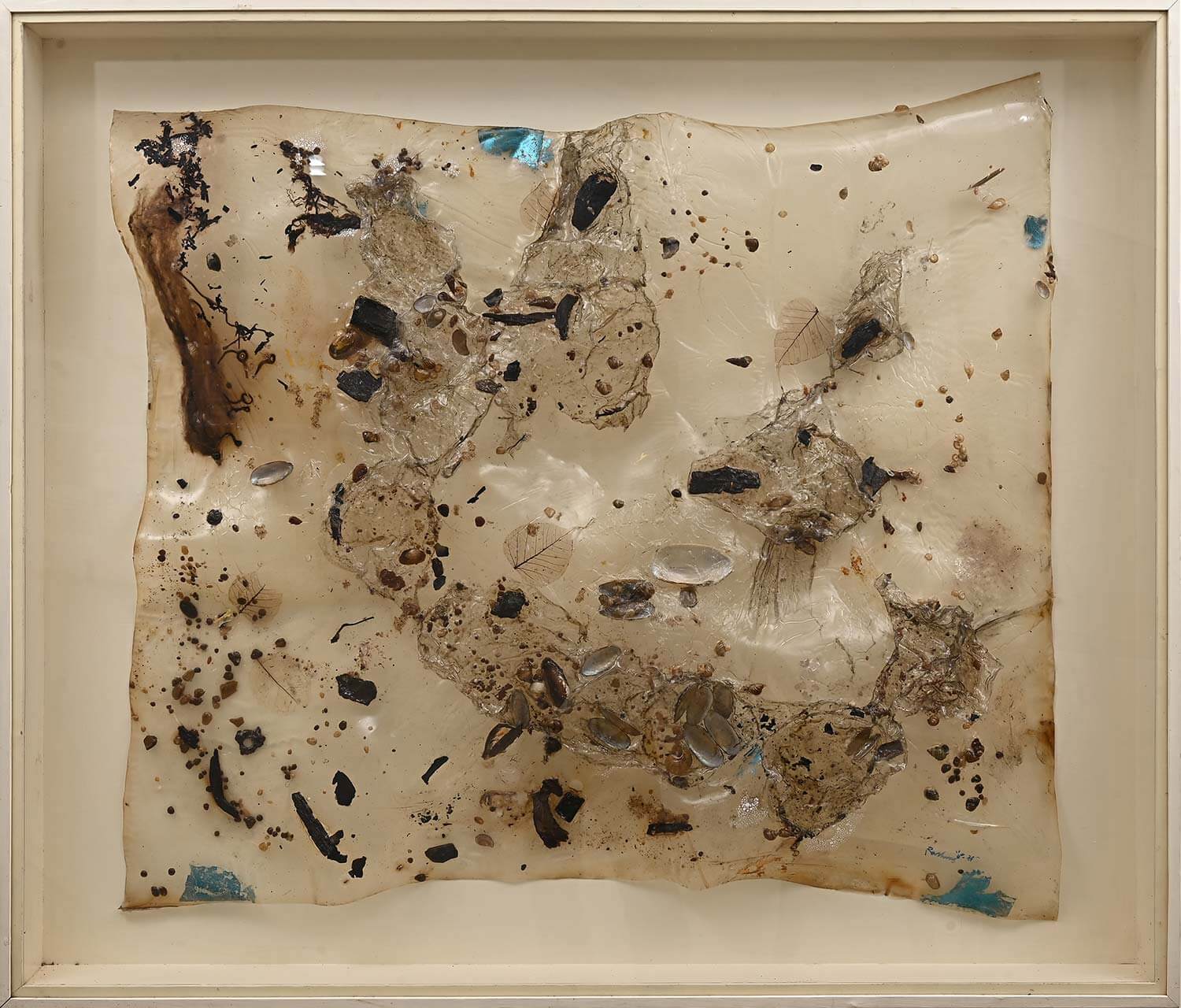 Polymar, river shell, carbonized wood, sand, silver leaf, laterite concretions
